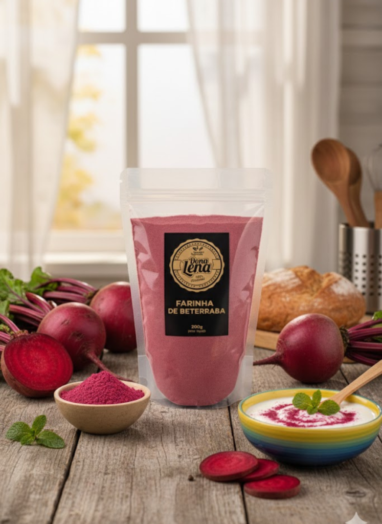 Além disso, a farinha de beterraba é valorizada por seu potencial de apoio à disposição e ao desempenho físico, sendo bastante utilizada em preparações funcionais. Versátil e fácil de usar, pode ser incorporada a sucos, vitaminas e receitas doces ou salgadas, agregando cor, nutrição e funcionalidade às preparações.