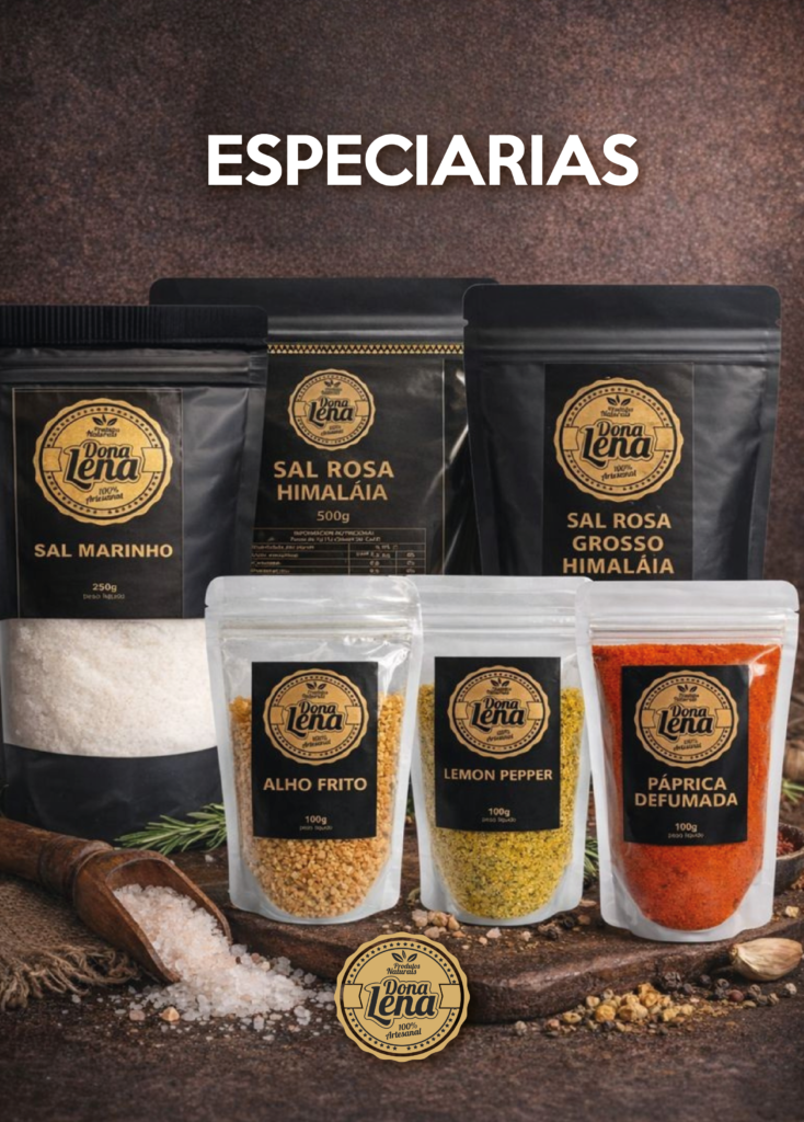 Da pureza dos sais à intensidade das especiarias e temperos, a linha Dona Lena reúne ingredientes de alta qualidade, cuidadosamente processados para preservar frescor, aroma e propriedades naturais. São opções versáteis, ideais para o dia a dia ou para criações culinárias mais elaboradas.